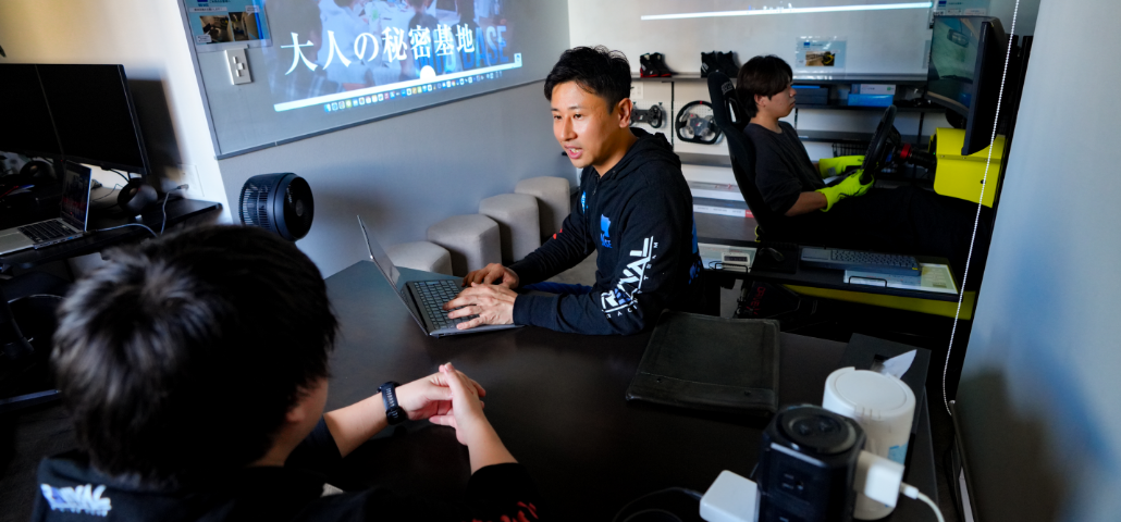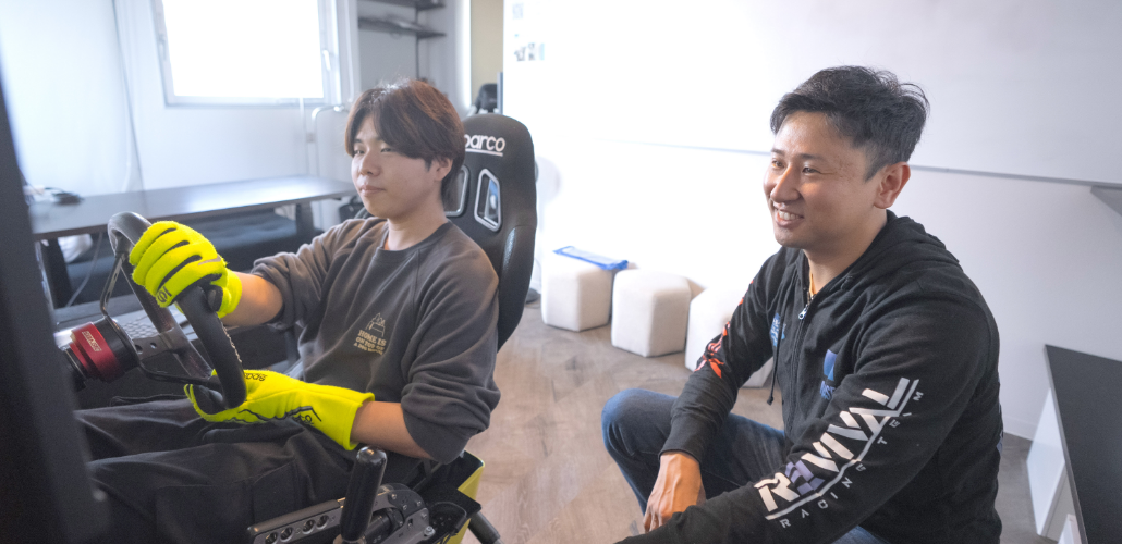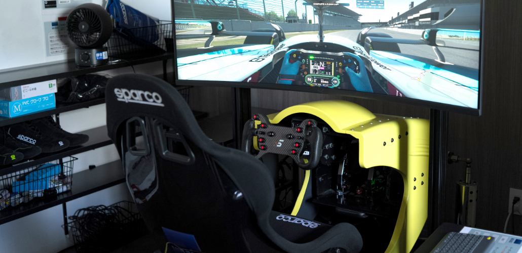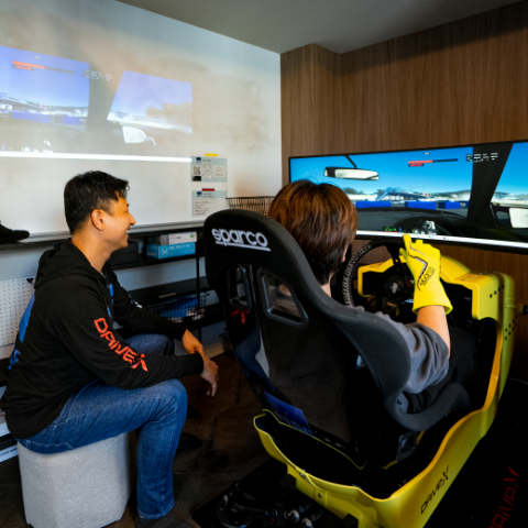 本物のレーサーの世界を体感できる美しいグラフィックの車体とプロ仕様のハンドルやグローブなど充実アイテム。レーシングシミュレータースペースは仕切られており、レーシングに没入できる空間となっている。