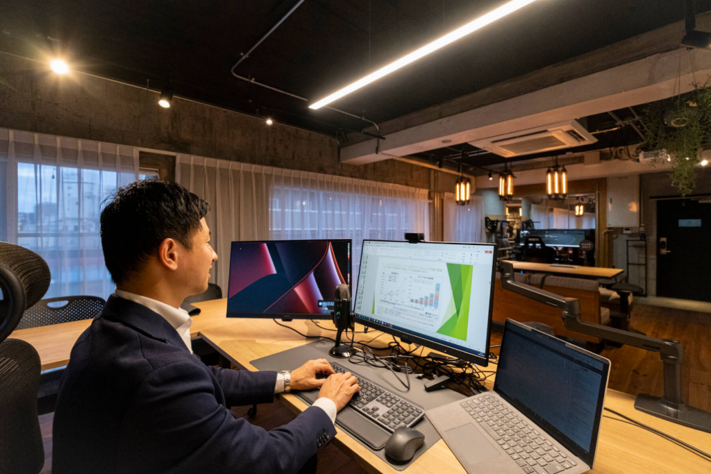 MID BASEの設備は、パソコンのモニターひとつをとっても、高品質のモニターを採用しており、他にもリモート用のマイク、キーボード、マウスなど、どれも最新の機器を揃えた環境を提供しています。長時間の作業にも集中できるよう、ワーキングチェアを採用し、快適さを追求。さらに、遮光ロールスクリーンも完備しており、外光を調整しつつ、最適な作業環境を整えています。